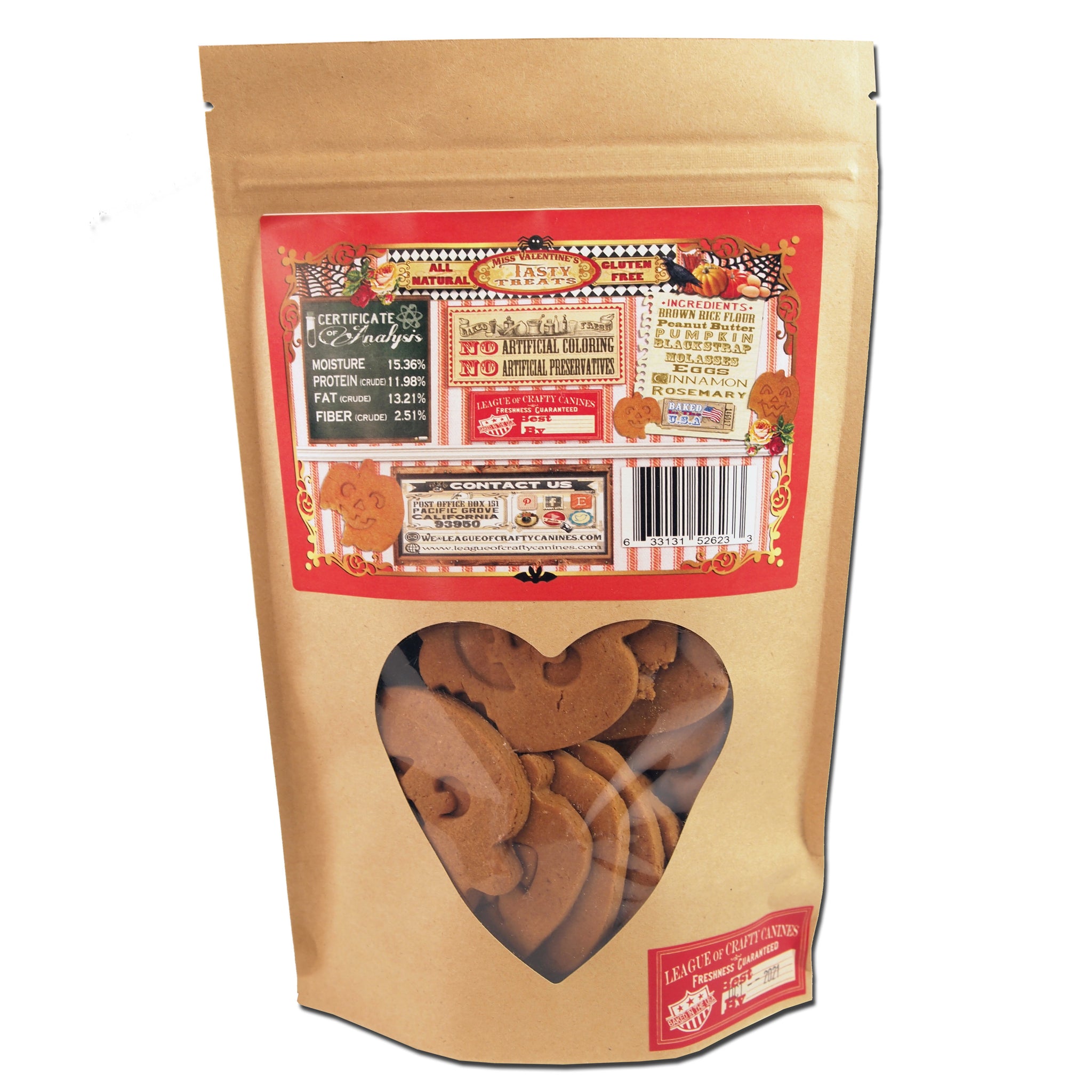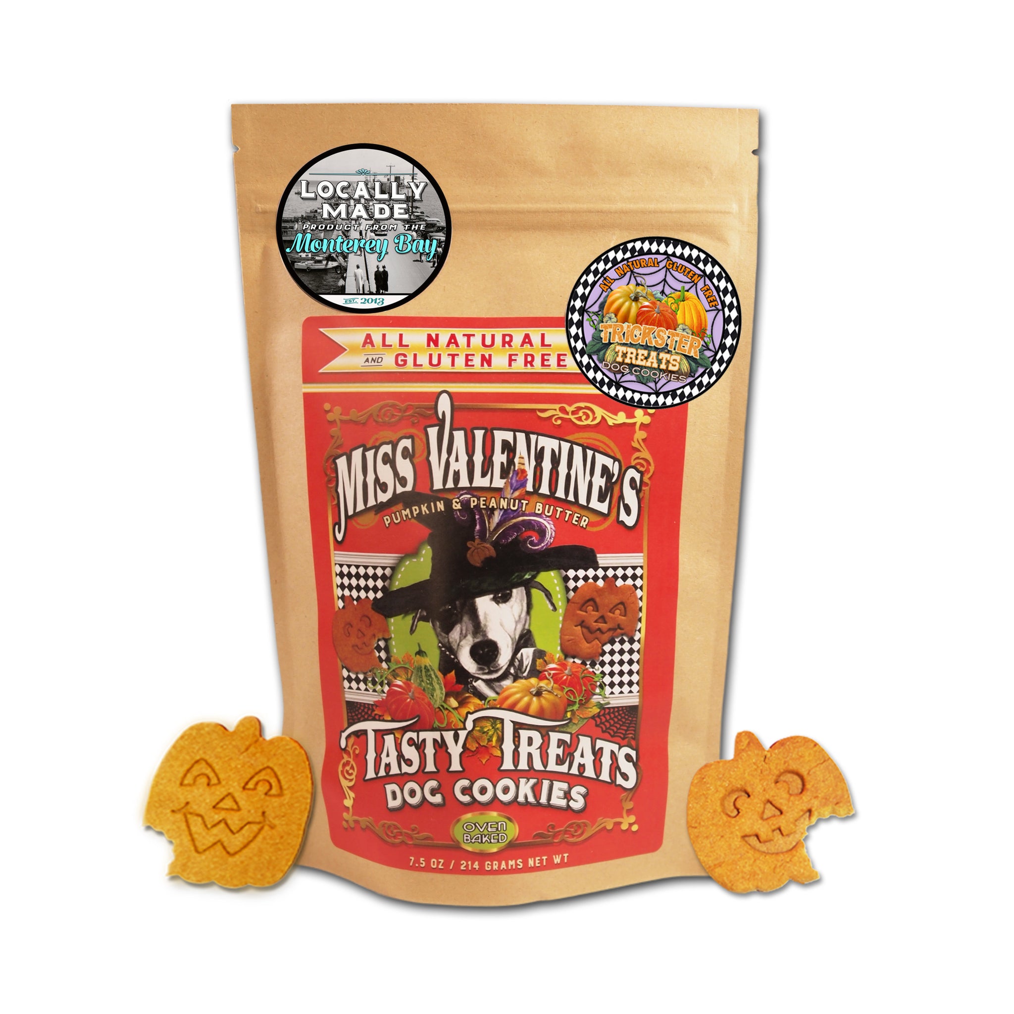 Within the middle of September and mid-November we produce a dog treat called "Trickster Treat" A Halloween and Autumnal theme is just part of the fun here as the flavor itself is what truly marks a Fall treat. The main flavors of the cookie feature delicious and soothing Pumpkin and doggie-fan favorite, Peanut Butter. The treats further include Brown Rice Flour (Bob's Red Mill brand), Blackstrap Molasses, Cage Free Eggs, Rosemary, and Cinnamon.